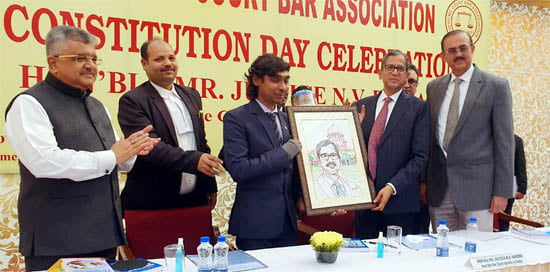 Apoorv Om present portrait of Shri N V Ramna to Hon’ble Chief Justice of India in Supreme Court Bar Association function 2021 On the event of LAW DAY at Supreme Court.