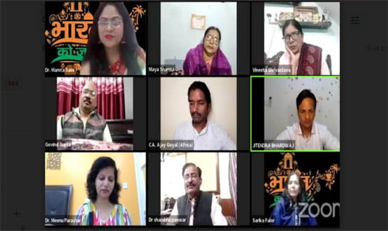 डॉ. अंजलि बजाज भारत को याद करके भावुक हो उठी। विनीता श्रीवास्तव , अब्दुल आरिफ खान, रुखसार खान, विक्की प्रसाद, डॉ. शिप्रा शिल्पी, डॉ. मीनू पाराशर, डॉ. श्वेता सिन्हा, समीर मूसा, ने कार्यक्रम में शामिल हो अपने भाव व्यक्त किए। उल्लेखनीय है कि इस अलौकिक कार्यक्रम में भारत देश के 28 राज्यों और 8 केंद्र शासित प्रदेशों की महिमा,लोक कला सँस्कृति का दोहों ,चौपाइयों और गीतों के माध्यम से 278 रचनाकारों ने बहुत ही सुंदर तरीके से भारत का गुणगान किया गया। रोज 3 घण्टे ऑनलाइन कार्यक्रम चला जिसे विश्व भर में लाखों लोगों ने देखा और खूब सराहा।50 से अधिक देशों के 500 से अधिक कवि, गीतकार,गायक,लेखको ने इस कार्यक्रम को भव्यता प्रदान की। यह आयोजन विश्व रिकार्ड में भी दर्ज होगा। इस आयोजन का शुभारंभ पद्मश्री अनूप जलोटा जी ने किया ।शानदार सन्चालन सीए अजय गोयल व जितेन्द्र भारद्वाज ने किया।