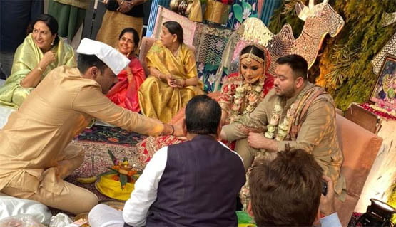 खबर के मुताबिक तेजस्वी यादव सगाई के बाद शादी करने के लिए दो महीने का ब्रेक चाहते थे लेकिन उन्होंने सगाई के अगले दिन ही शादी कर ली. तेजस्वी यादव की शादी और सगाई दोनों का कार्यक्रम बहन मीसा भारती के सैनिक फार्म में हुआ. कड़ी सुरक्षा के बीच अंदर आने और जाने वाली सभी गाड़ियों को सख्ती से चेक किया जा रहा था. बताया जा रहा है कि वेन्यू में एंट्री के लिए थ्री लेयर सिक्योरिटी लगाई गई थी. मीडिया के वेन्यू के पास आने पर भी सख्त पाबंदी लगाई गई थी. लेकिन अब तेजस्वी की शादी की तस्वीरें सामने आई हैं. लाल जोड़े में सजीं ऐलेक्सिस और गोल्डन शेरवानी में दूल्हा बने तेजस्वी यादव एक साथ बहुत जंच रहे हैं.