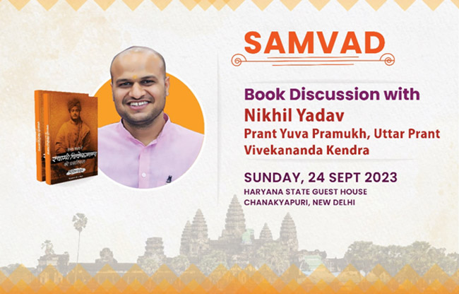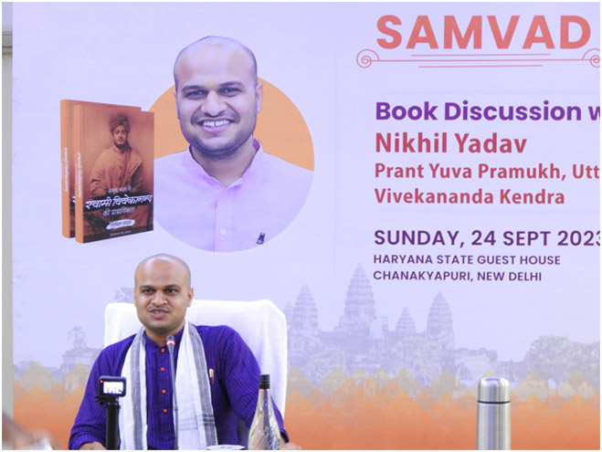 रविवार, 24 सितम्बर 2023 को हरियाणा राज्य अतिथि गृह, चाणक्यपुरी में स्वामी विवेकानन्द पर एक पुस्तक जिसका शीर्षक है “अमृत काल में स्वामी विवेकानन्द की प्रासंगिकता” का विमोचन कार्यक्रम हुआ। पुस्तक श्री निखिल यादव, प्रान्त युवा प्रमुख, विवेकानन्द केन्द्र, उत्तर प्रान्त द्वारा लिखी गयी है। वह पीएचडी शोधार्थी , विज्ञान नीति अध्ययन केंद्र, जवाहरलाल नेहरू विश्वविद्यालय, नई दिल्ली में । पुस्तक में स्वामी विवेकानन्द के जीवन और सन्देश के विभिन्न पहलुओं को शामिल किया गया है। विमोचन कार्यक्रम में दिल्ली विश्वविद्यालय, जेएनयू और नई दिल्ली के अन्य शैक्षणिक संस्थानों के कई विद्वानों, प्राध्यापकों, छात्रों और संकाय सदस्यों ने भाग लिया।